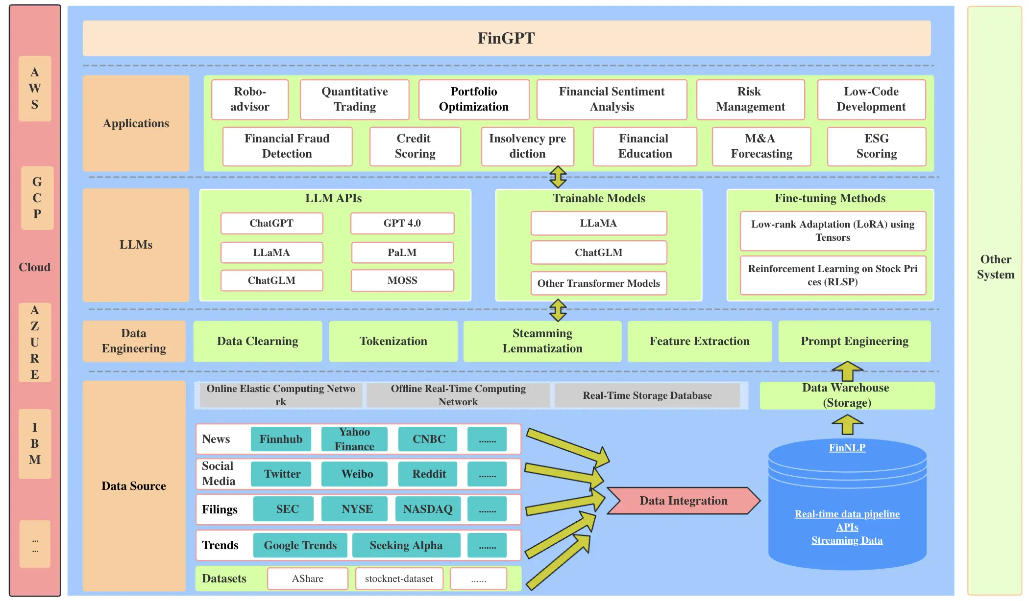 - Фреймворк полного цикла: FinGPT включает в себя полноценную архитектуру для FinLLM, состоящую из четырёх уровней: