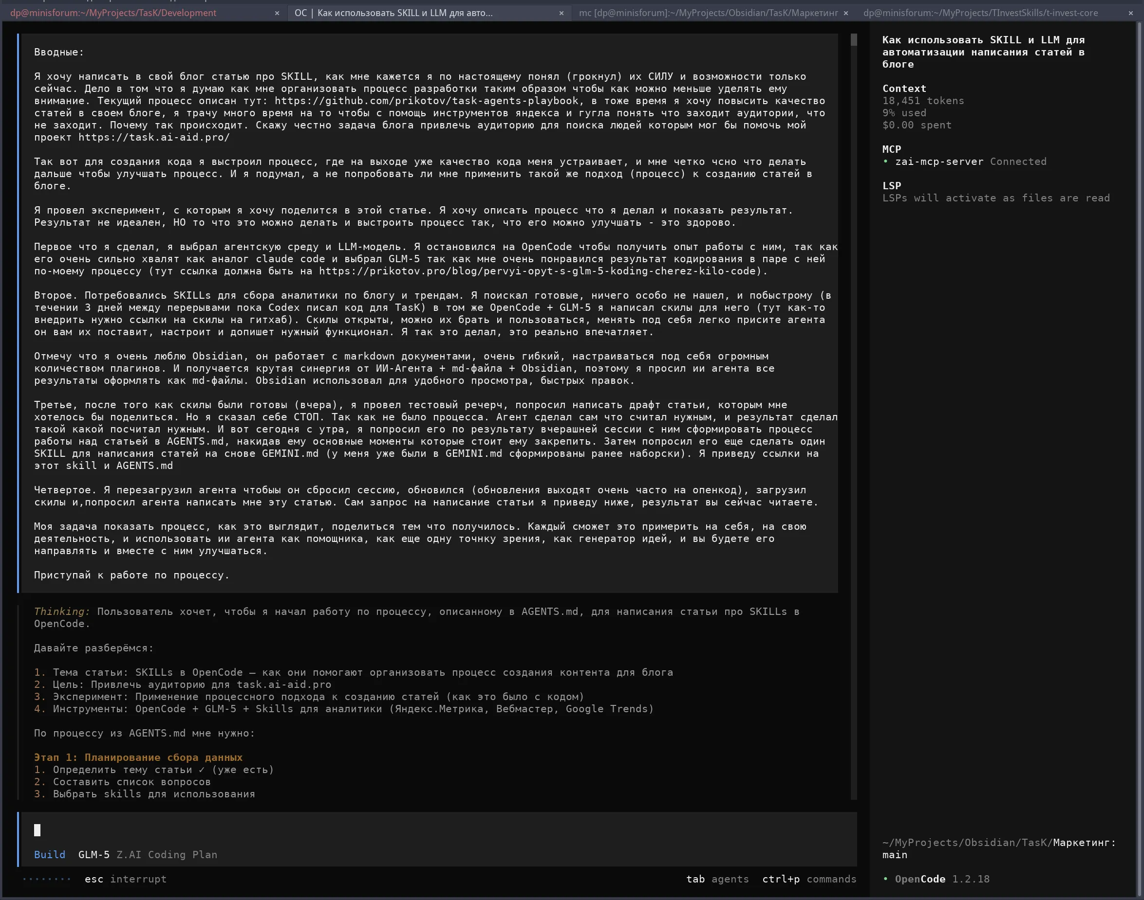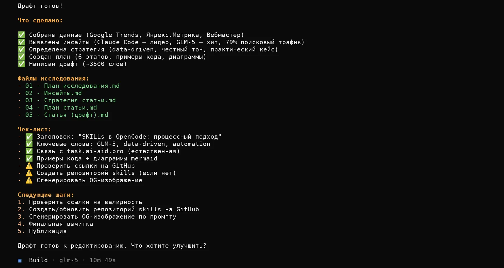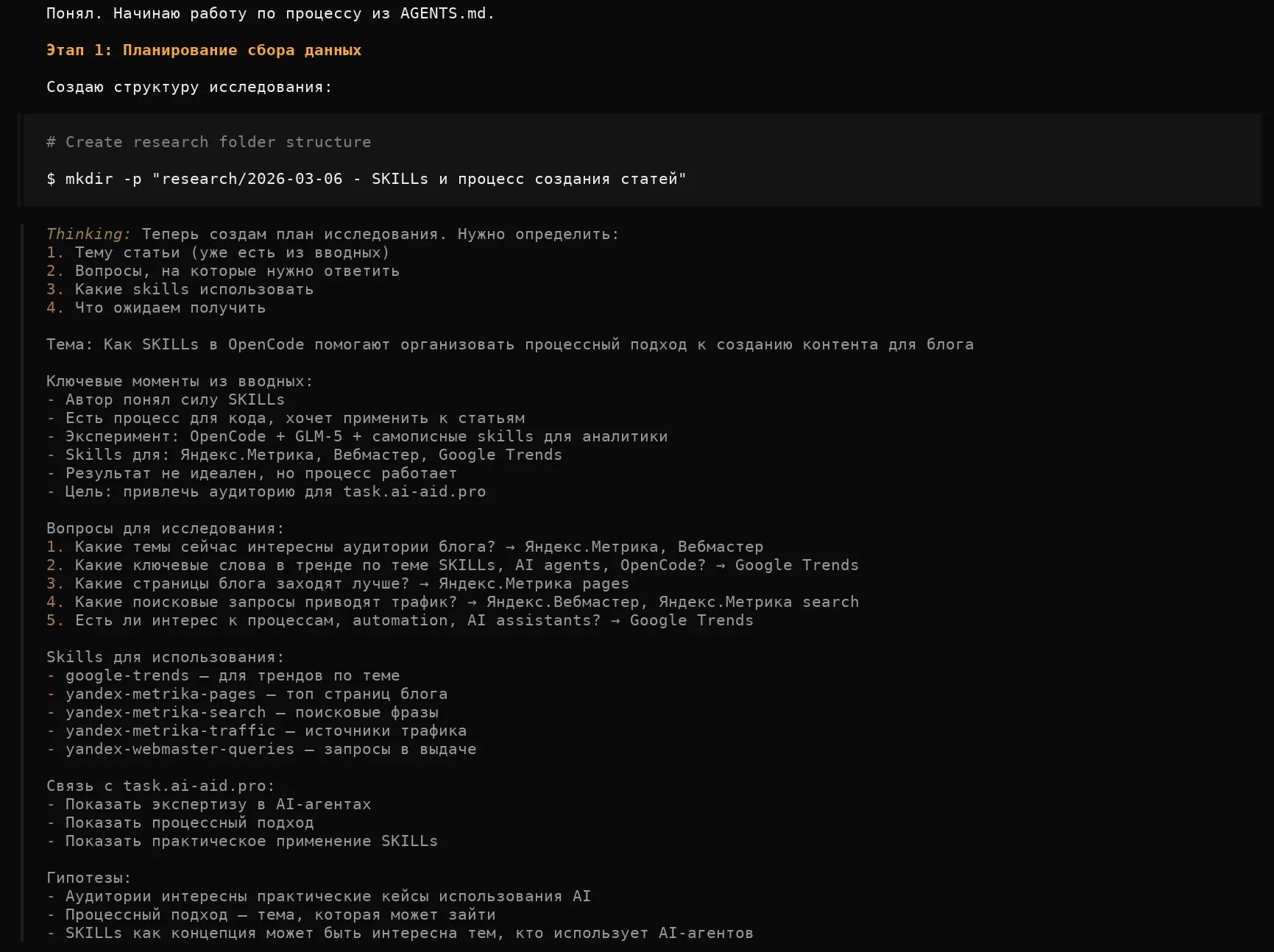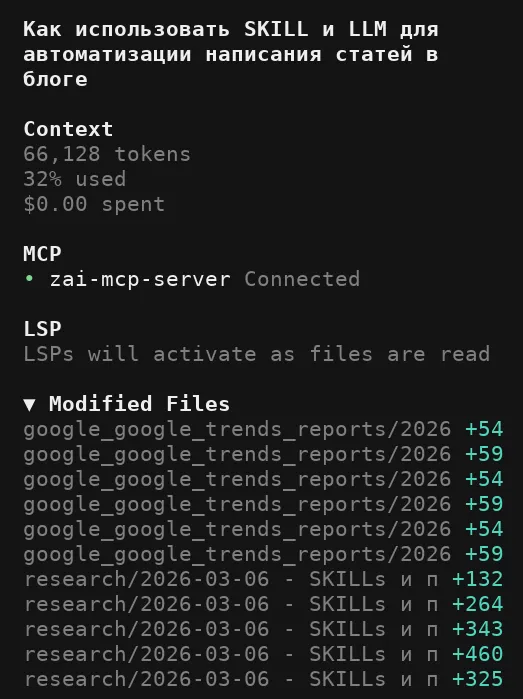 Как я выстроил процесс создания статей с SKILLs в OpenCode. Открытые skills для аналитики блога. Эксперимент с GLM-5.