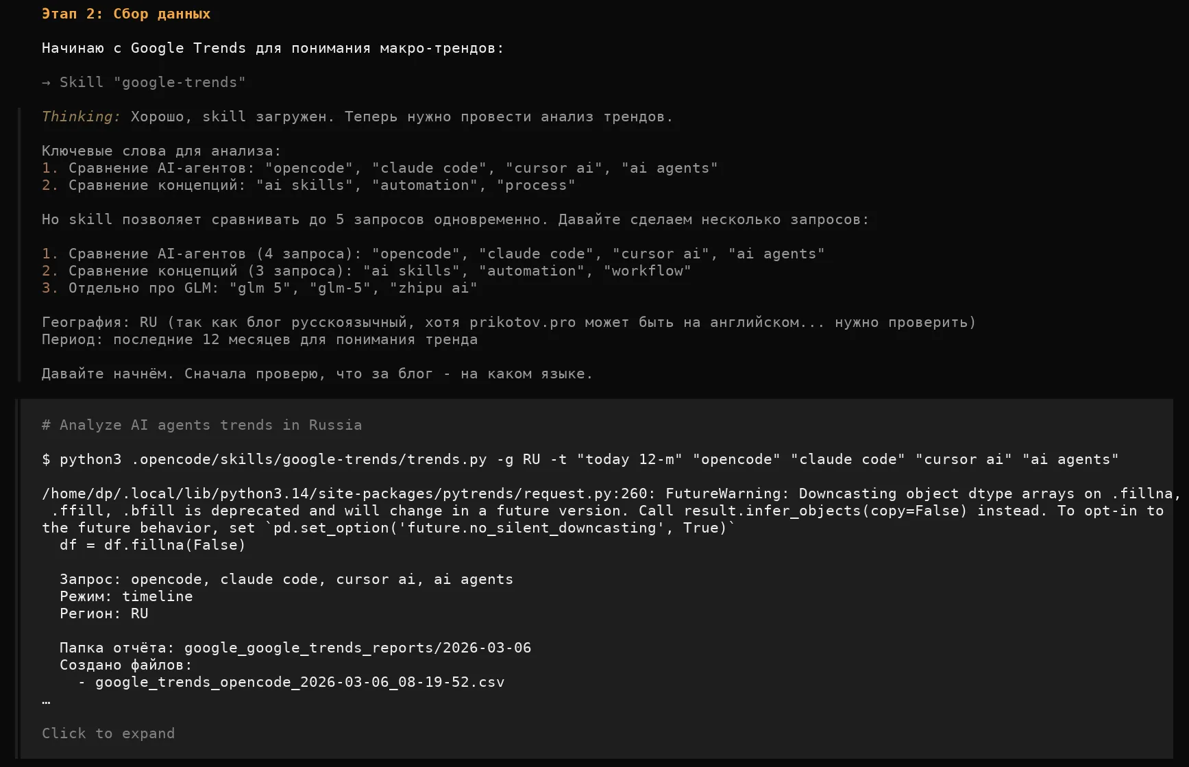1. Поиск готовых skills. Искал skills для сбора аналитики по блогу и трендам. Ничего не нашёл.