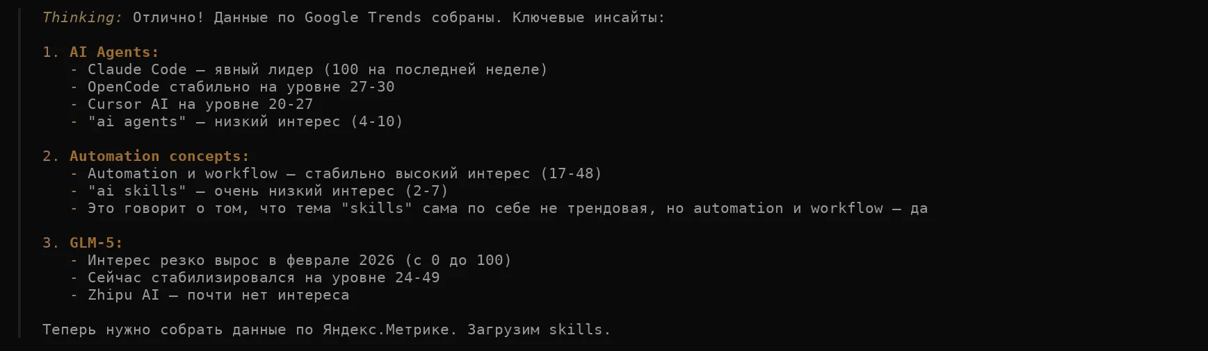 Автоматизация рутины и мышления. Агент собирает данные, анализирует, предлагает структуру. Я направляю и улучшаю.