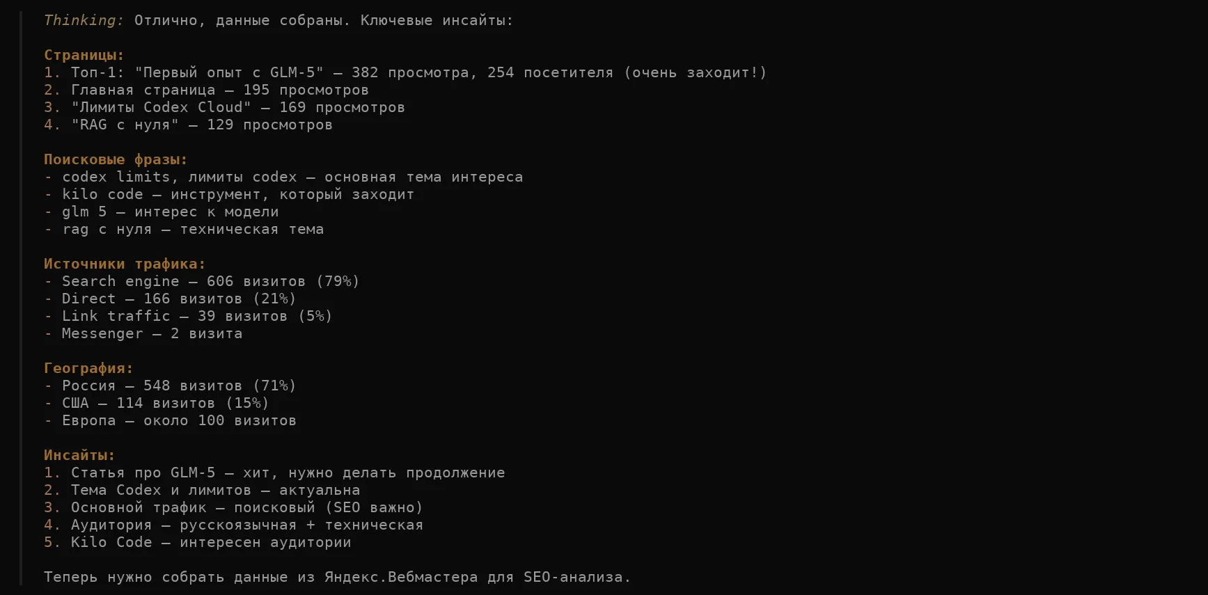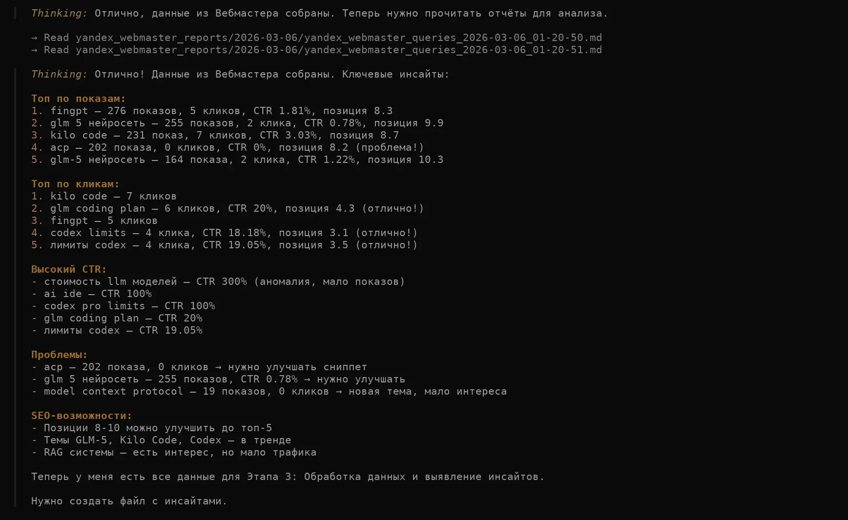 Инсайты можно глубже. Например, агент заметил, что fingpt имеет низкий CTR (1.81%), но не предложил конкретных решений.