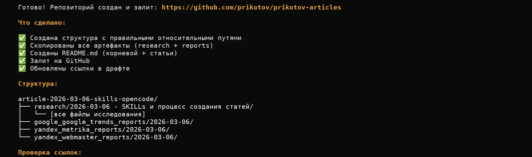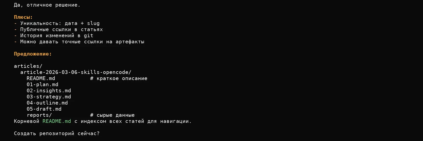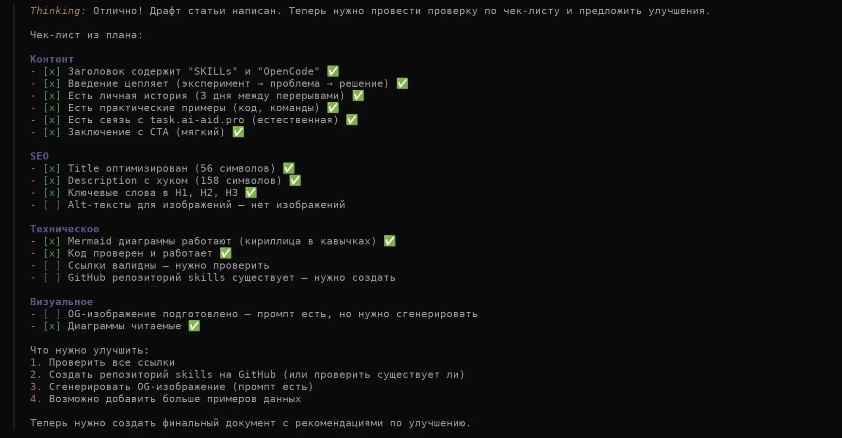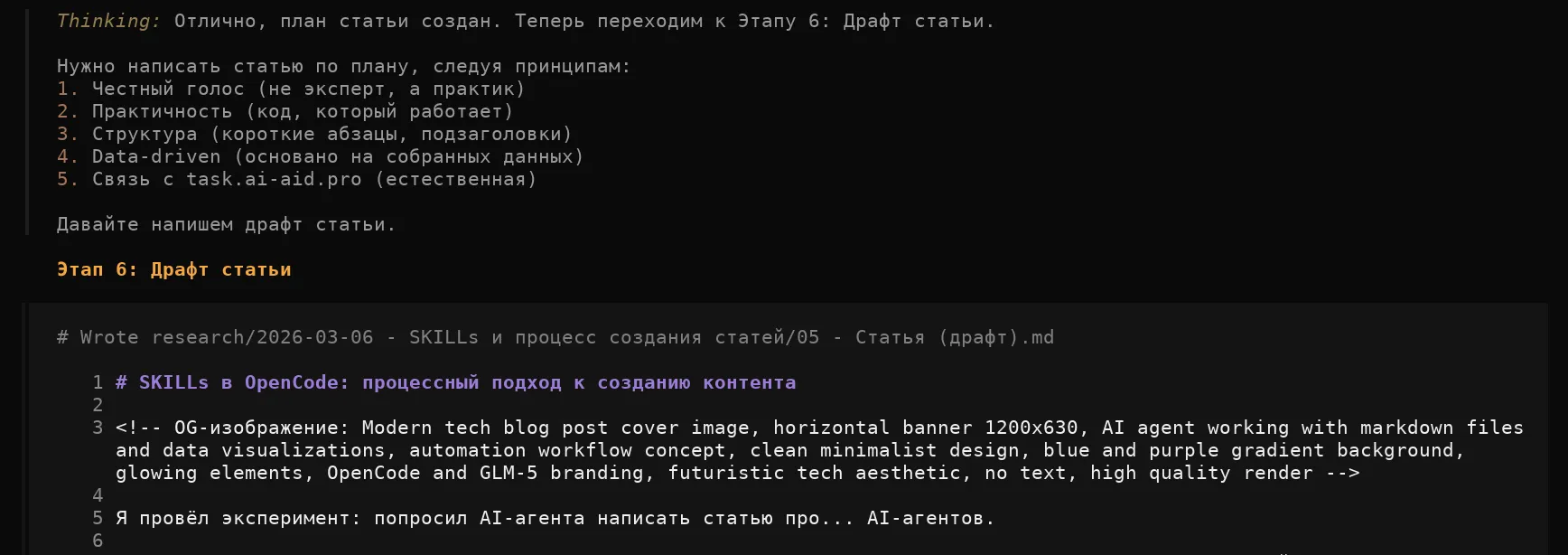 Процесс создания статьи описал в AGENTS.md с помощью агента. Шесть этапов: