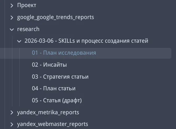 - Артефакты исследования — данные, план, драфт