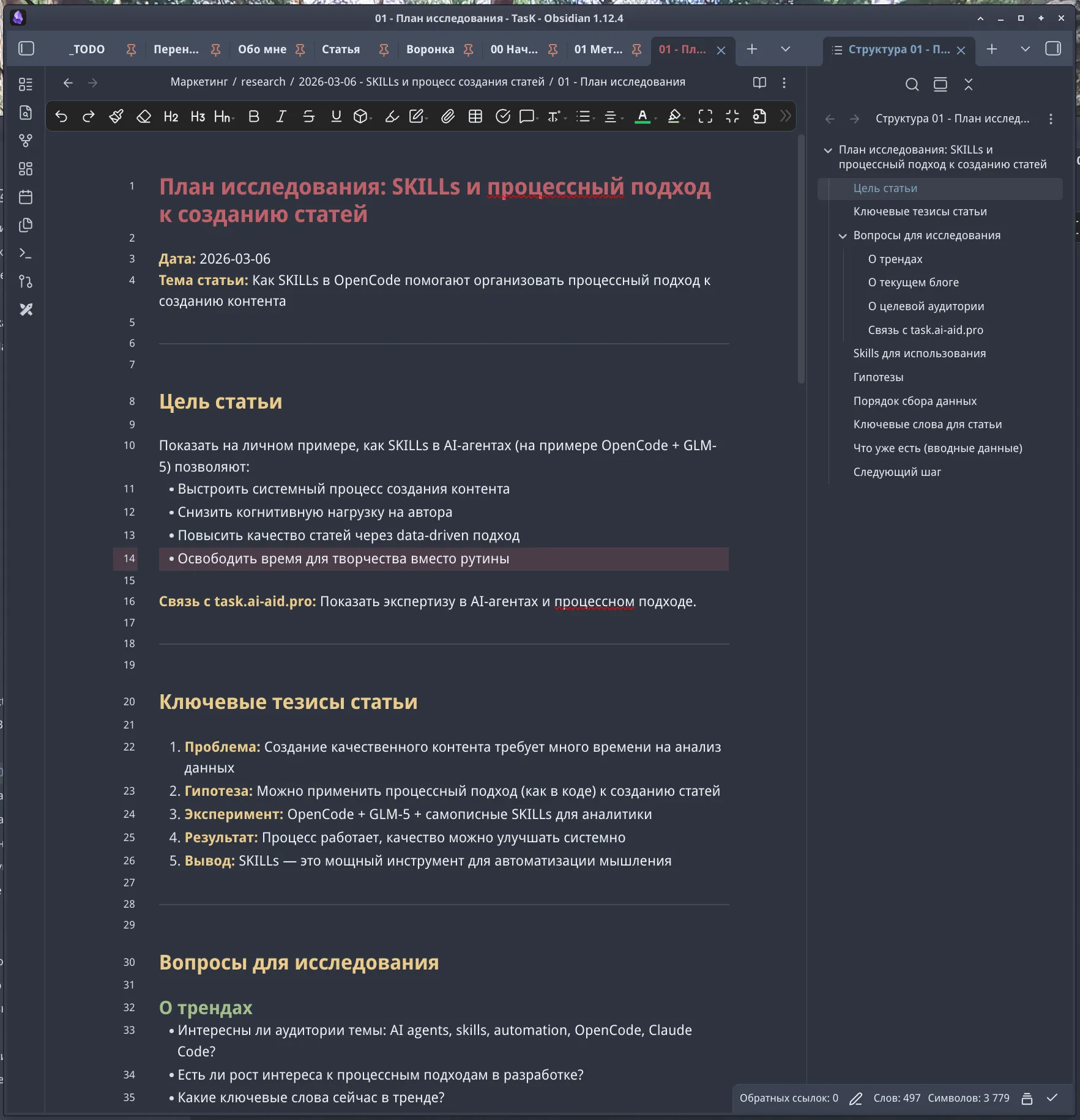 Obsidian — среда для заметок. Люблю за работу с markdown, гибкость, плагины. Получается крутая синергия: AI-агент + MD-файл + Obsidian. Поэтому прошу агентов оформлять все результаты как MD-файлы.