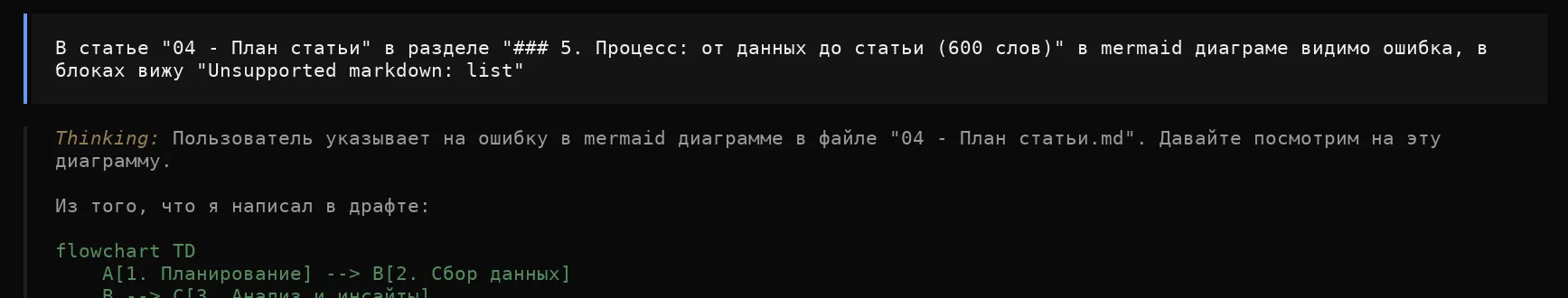 Вчера экспериментировал с агентом "надо больше mermaid-диаграмм". Примеры: