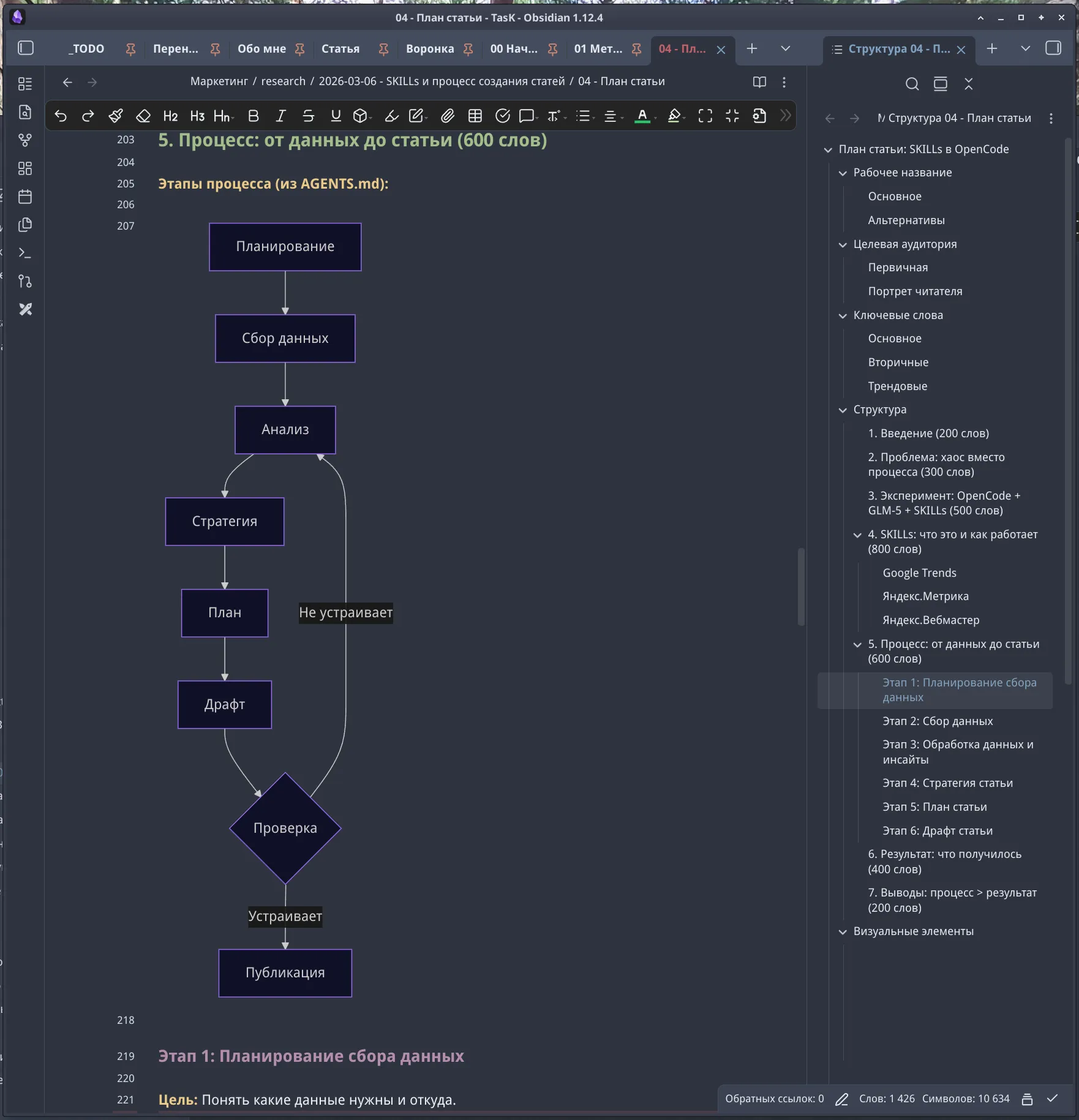 4. Формирование процесса. Попросил агента по результату вчерашней сессии описать процесс работы над статьёй. Накидал основные моменты — агент оформил это в AGENTS.md.