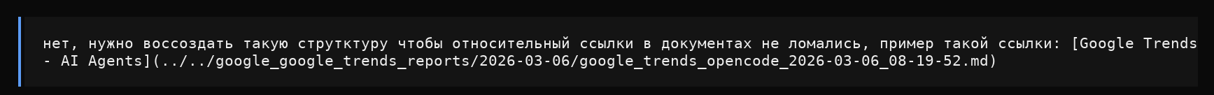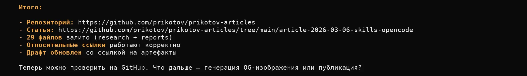 5. Перезагрузка агента. Сбросил сессию, обновился (OpenCode обновляется часто), загрузил обновлённые skills и AGENTS.md.