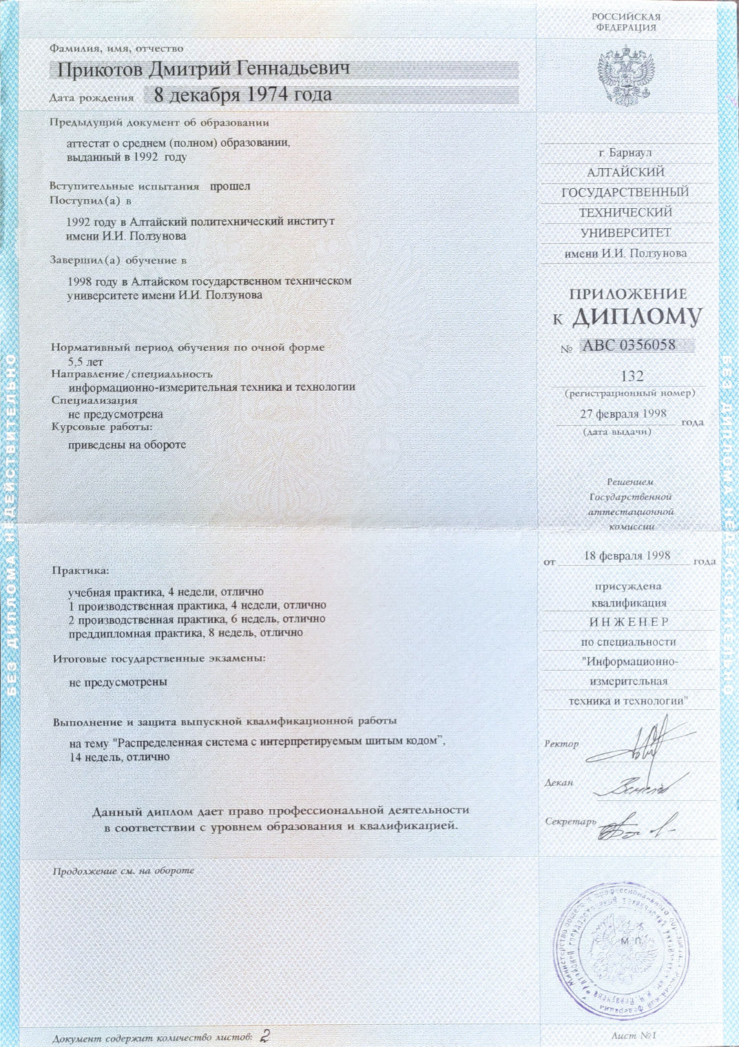 Вне основной учебной программы участвовал в группе под руководством преподавателя Владимира Вигуля. Мы создали на ассемблере интерпретатор языка программирования Forth на платформе i386 и небольшую экосистему вокруг него.