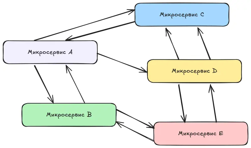 Если соединять микросервисы прямыми RPC- или API-вызовами, создаётся хаос взаимозависимостей. В такой архитектуре отказ одного сервиса может парализовать всю систему.