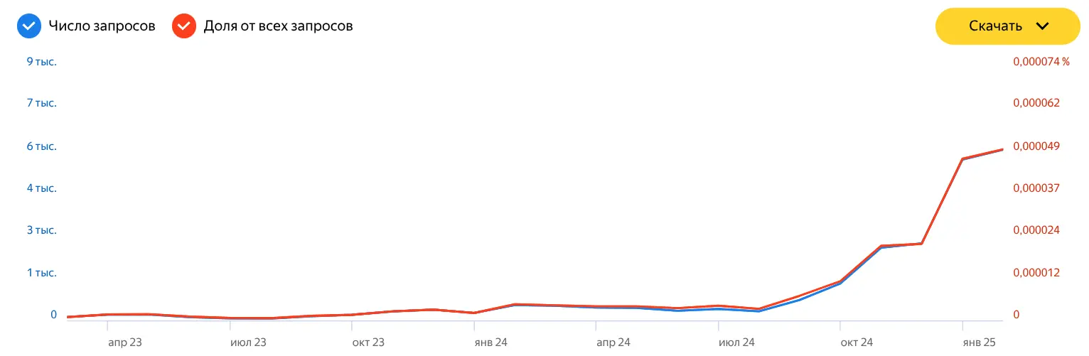 Популярность запроса "ИИ агенты" на Яндекс Вордстат (wordstat.yandex.ru):