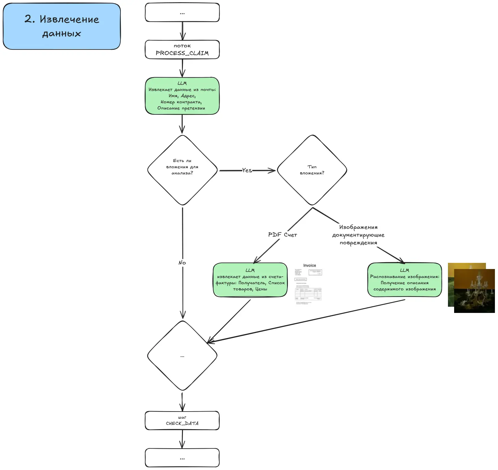 Извлечение данных не ограничивается текстовым содержимым (из текста письма), но также может включать данные из изображений, PDF-файлов и других документов. Для этого мы используем не одну модель, а сразу несколько: LLM, модели распознавания изображений, OCR и другие.