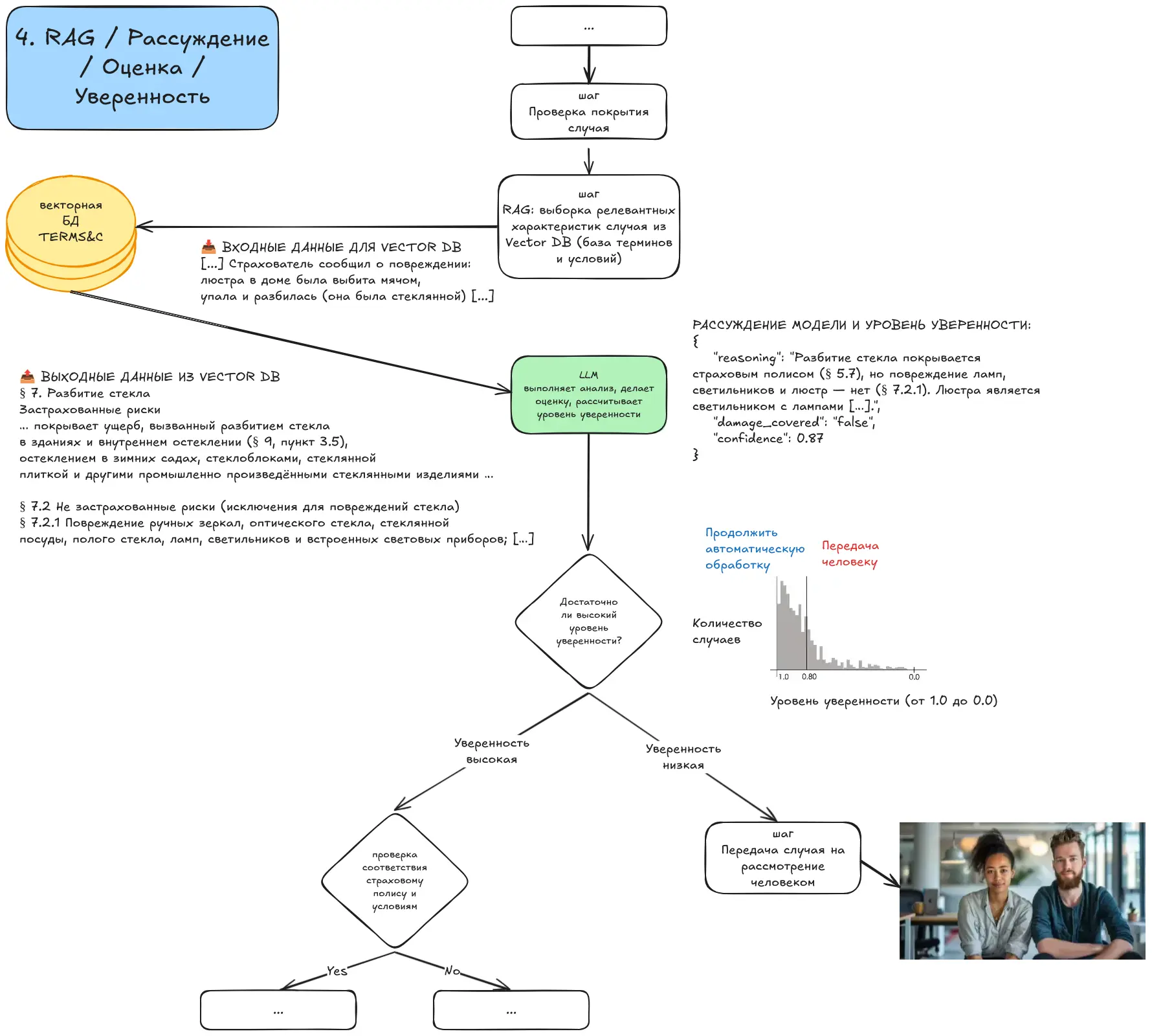 Суть любой административной работы заключается в интерпретации входящих случаев в соответствии с различными правилами. ИИ особенно хорош в этом. Поскольку при вызове модели мы не можем передать всю контекстную информацию (например, содержание полиса или условия страхования), мы используем векторную базу данных для поиска релевантных фрагментов — этот метод известен как RAG.