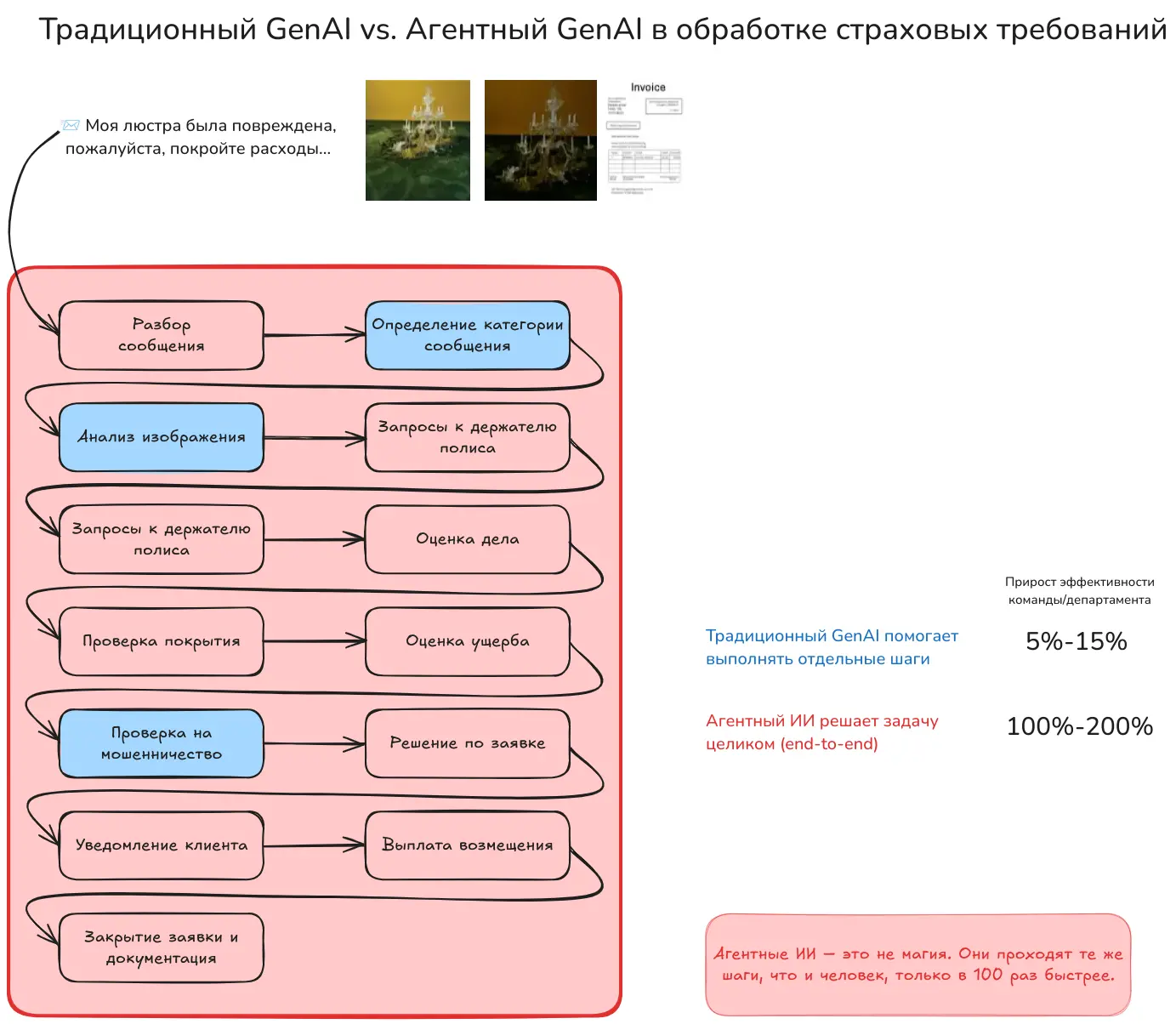 Удивительно, но такая система может автоматизировать 70%–90% рабочей нагрузки отдела управления страховыми претензиями. И это невозможно с простыми генеративными ИИ-системами эпохи до агентов. Два года назад я и представить не мог, что это станет реальностью так быстро.