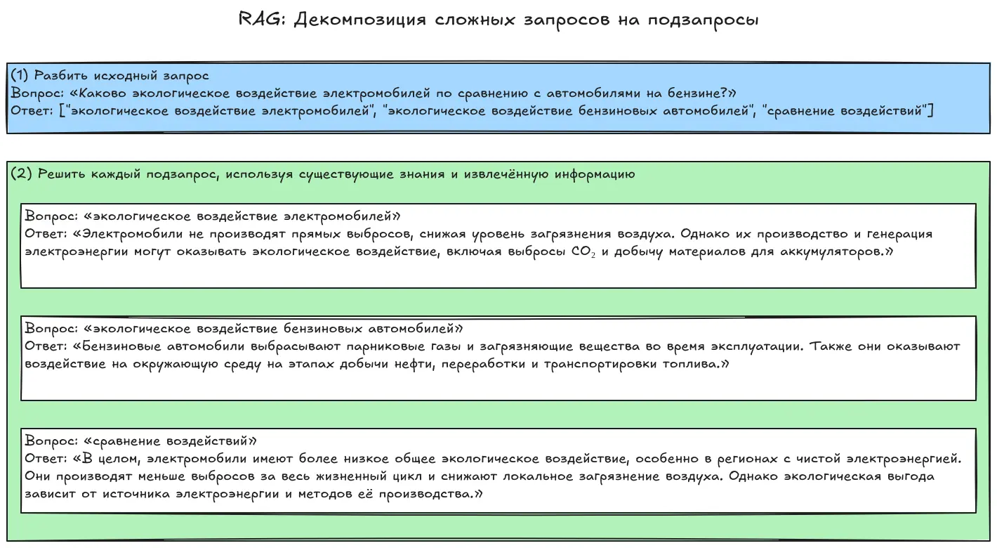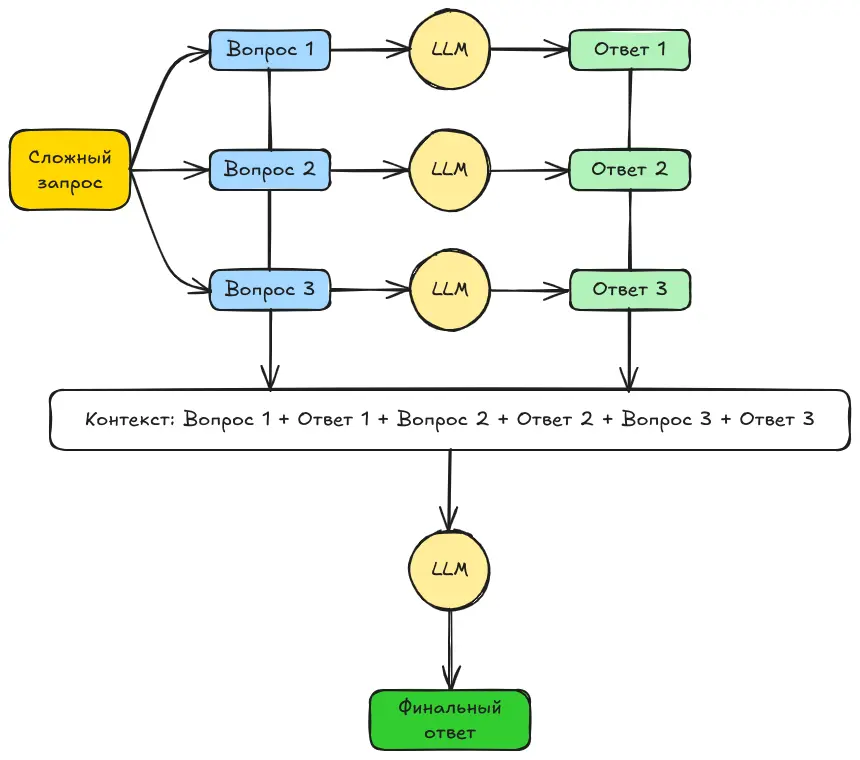 Этот метод заключается в том, чтобы разбить сложный запрос на цепочку более простых, небольших вопросов. Когда большая языковая модель (LLM) отвечает на первый из них, мы используем сам вопрос и его ответ как контекст для следующего.