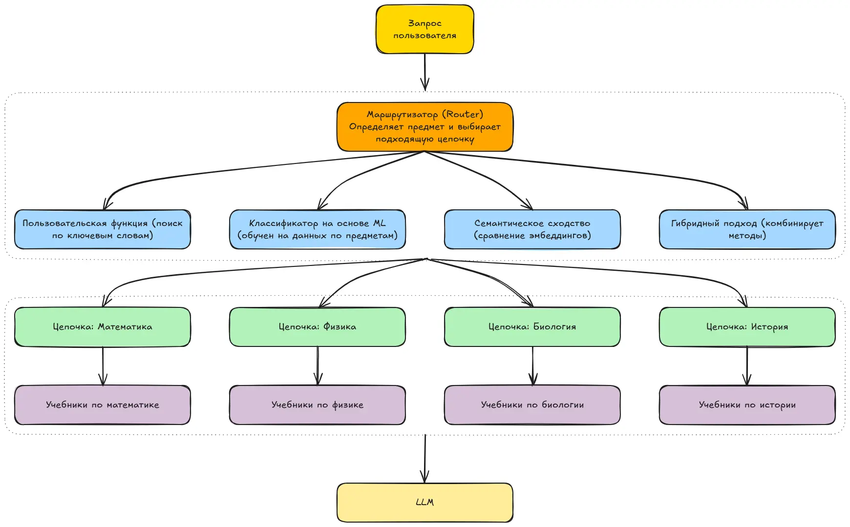 Если у вас много запросов по разным предметам — физика, математика и т.д. — и вы хотите, чтобы система автоматически определяла, о каком предмете идёт речь, вы можете обучить классификатор. Он будет относить запрос к нужной категории, и после этого система направит его к соответствующим учебникам или цепочке, связанной с этим предметом.