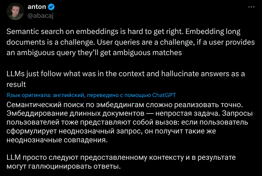 Это была самая базовая версия пайплайна RAG. Но стоит учесть важный момент, отражённый на изображении из твита: RAG используется для ответа на запросы к приватным данным, если сам запрос сформулирован достаточно чётко. То есть, он может быть выражен иначе, чем формулировки в самих документах. Проблема в том, что модель может попросту не понять, что именно вы хотите — и в таком случае запрос нужно предварительно переформулировать.